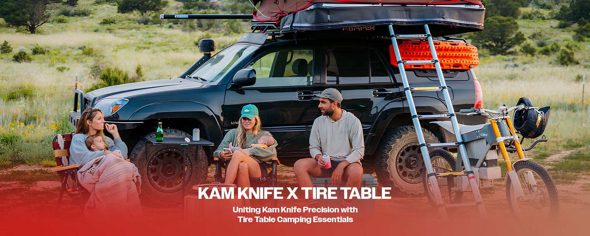 Experience the perferct synergy of outdoor adventure with our collaboration, combining Kam Knife's precision blades with Tire Table's innovative camping equipment, ensuring nature enthusiasts embark on unforgettable journeys equipped with the best tools fot the wilderness.